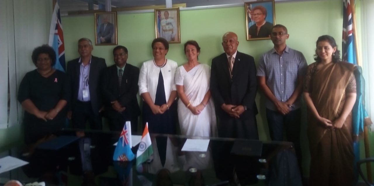 Permanent Secretary Josefa Koroivueta, Ministry of Women, Children and Poverty Alleviation and Director of Barefoot College International, Meagan Fallone, signed this historic agreement following 5 years of successful implementation of the Barefoot Approach in collaboration with The Government of India ITEC (India Technical Economic Cooperation), which has brought renewable energy to more than 3500 people across three islands of Fiji. The Hon. Mereseini Vuniwaqa, Minister of Women, Children and Poverty Alleviation, High Commissioner of India, Excellency Vishvas Sapkal and Ms Suriya Ansari of the Barefoot College were all present.